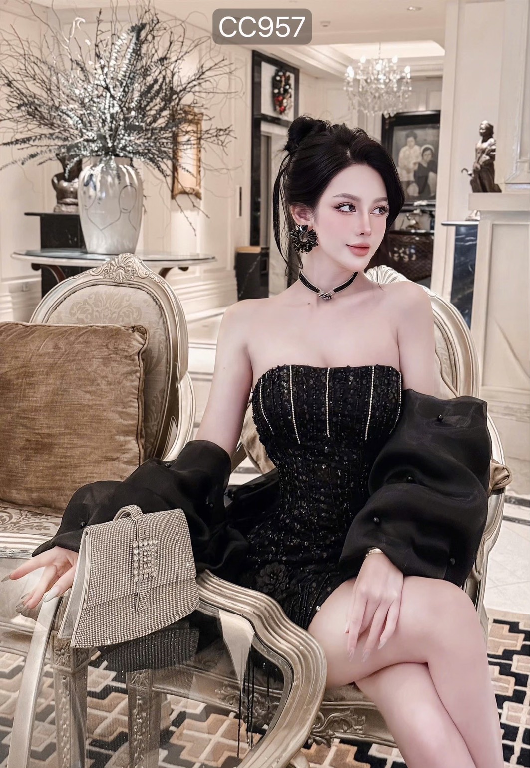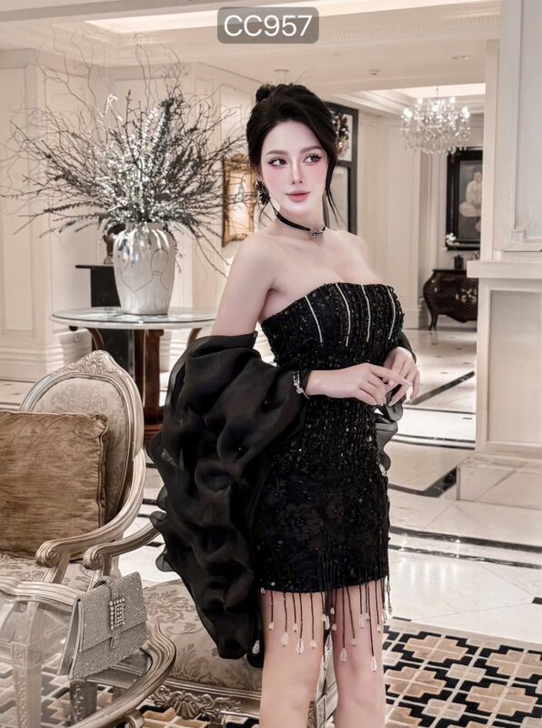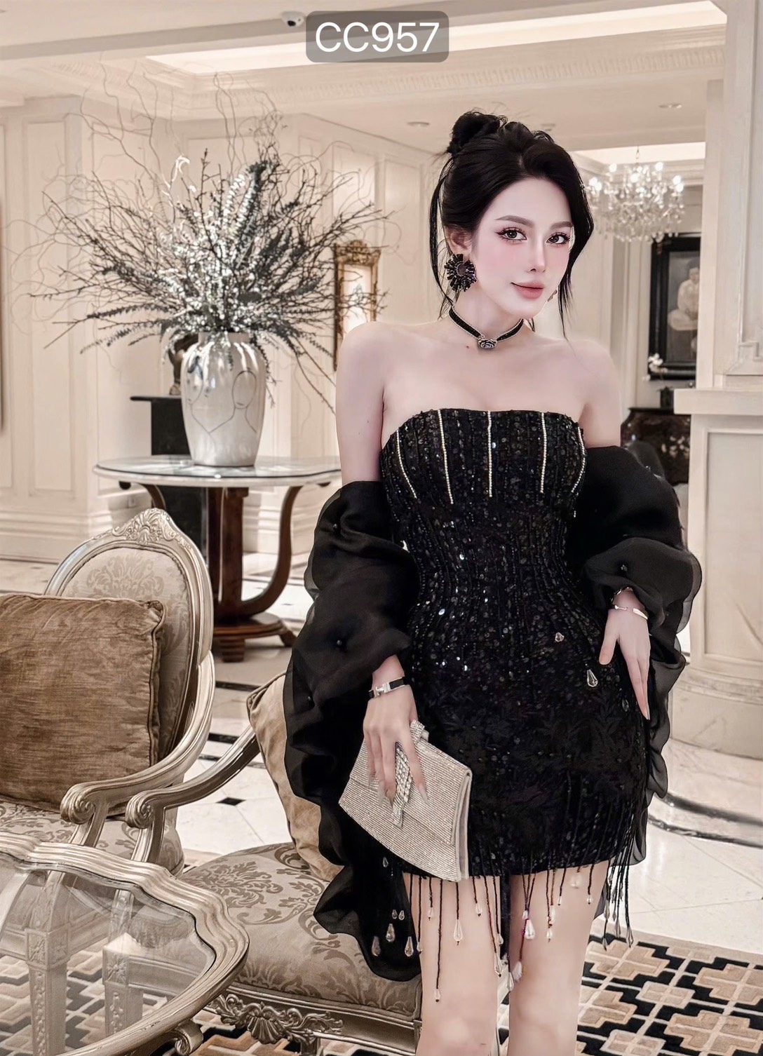 ชุดเดรส เกาะอก แต่งเพชร + ดอก สีชมพู สีดำ Brand HiSo 2185 Size S-M