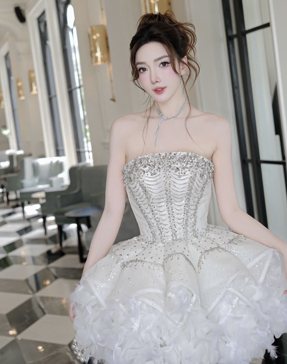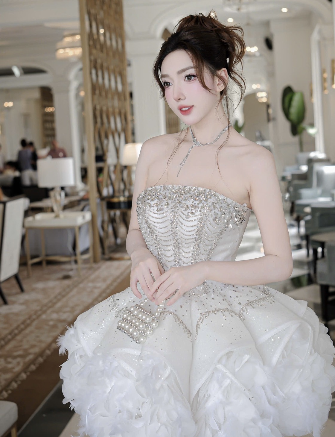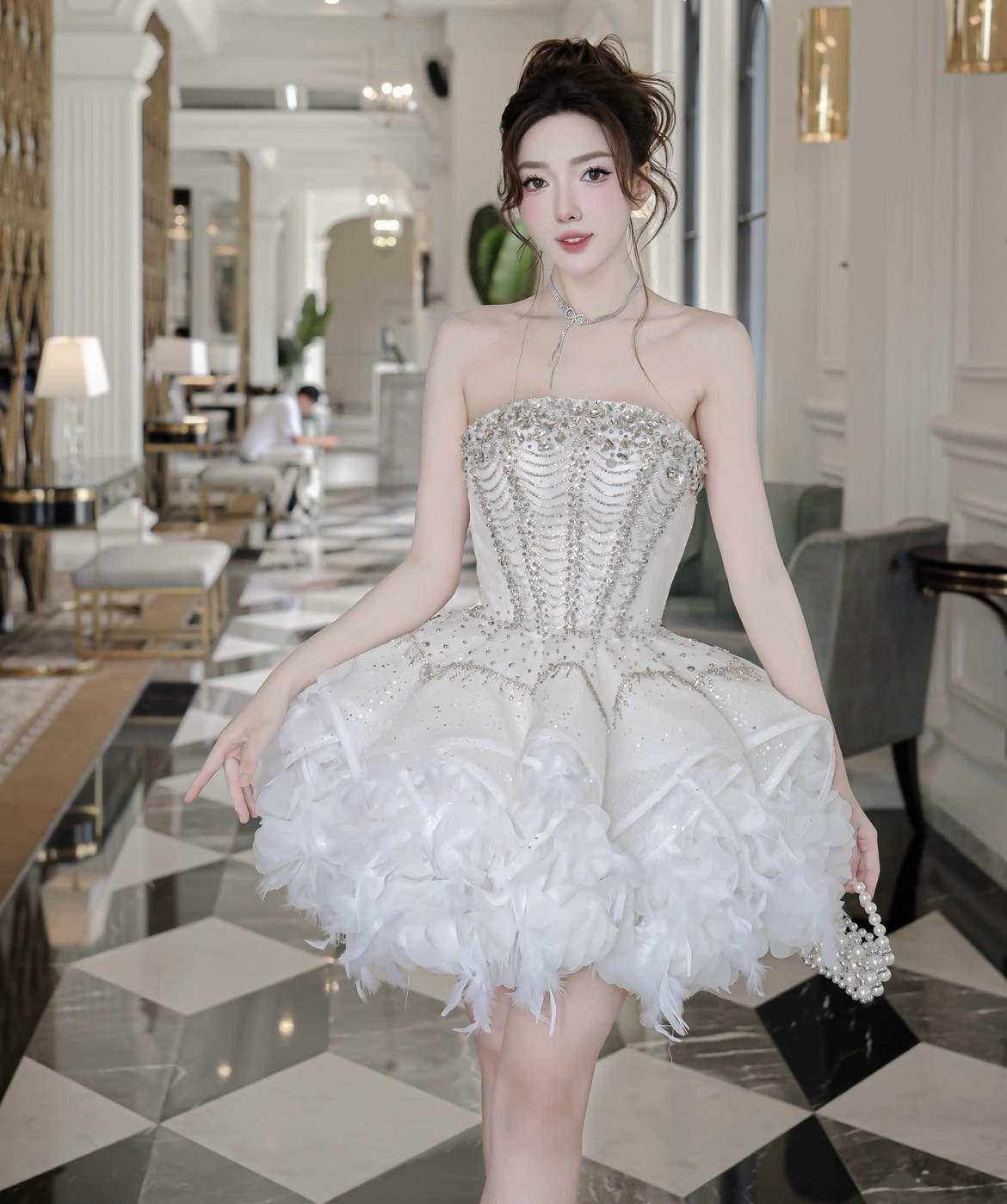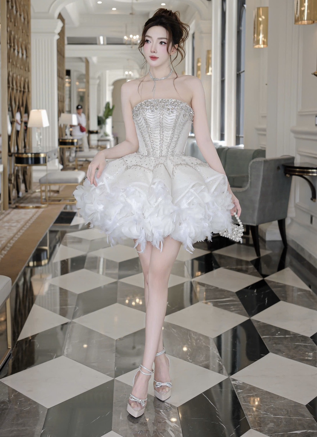 ชุดเดรส เกาะอก แต่งเพชร+กลิตเตอร์ สีขาว 2021 Size M
