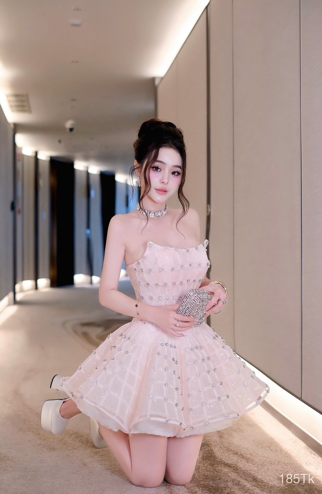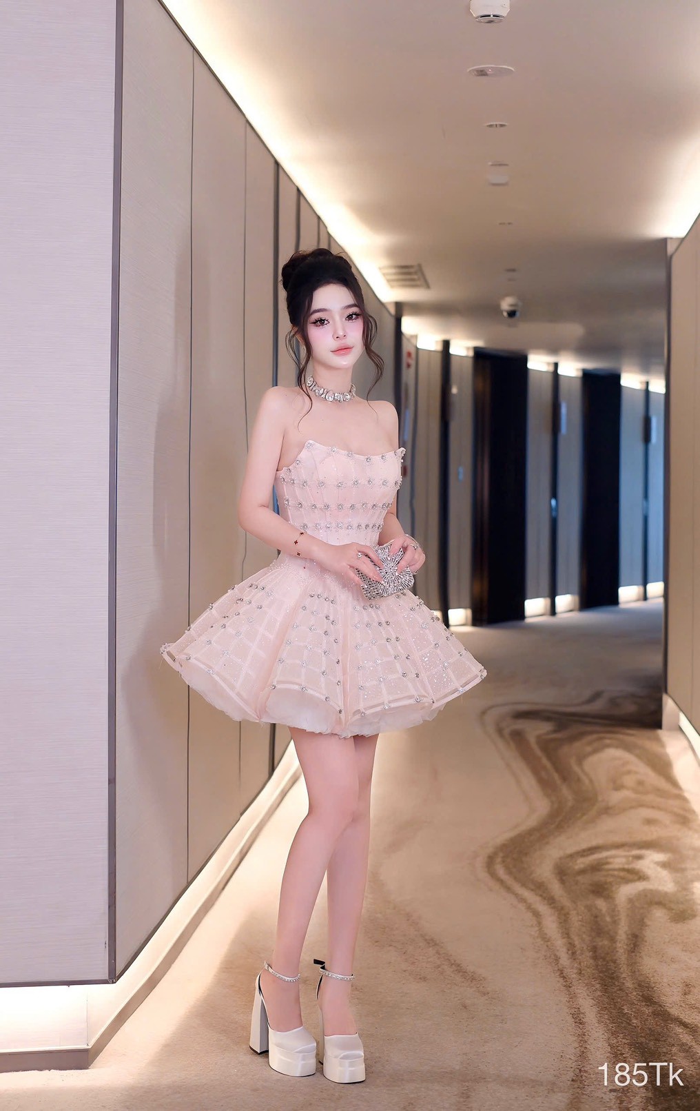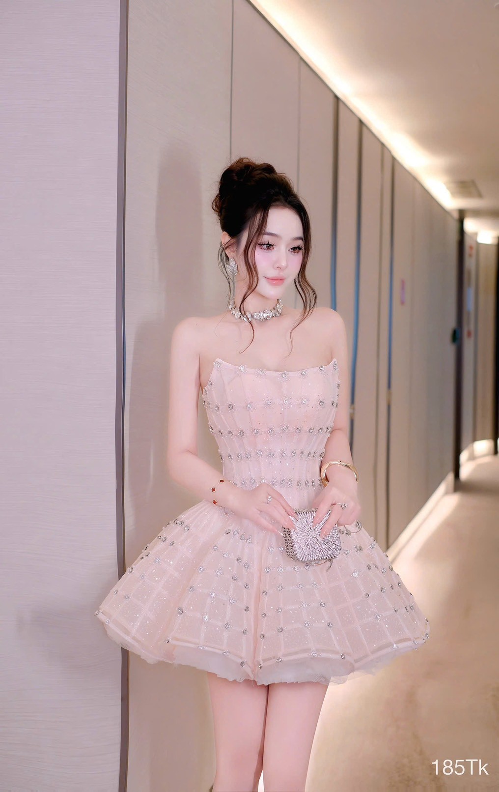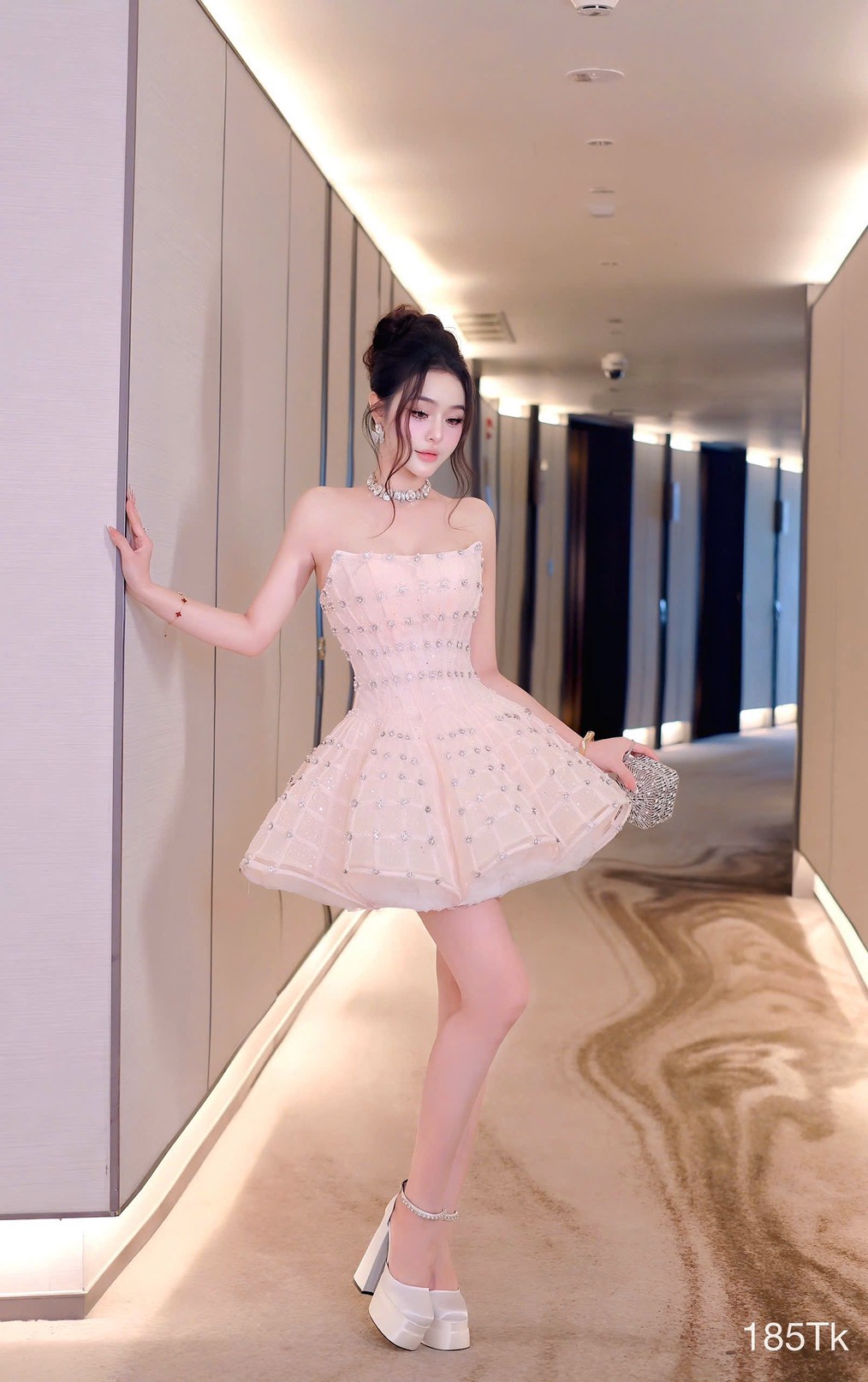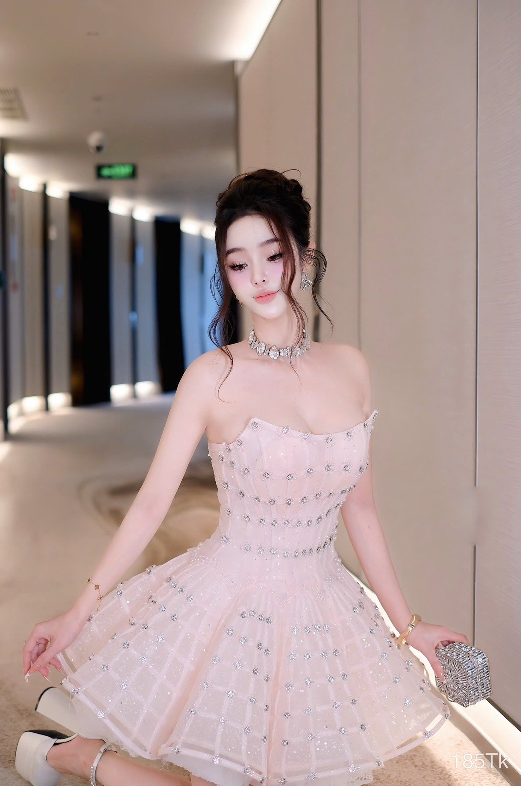 ชุดเดรส เกาะอก แต่งเพชร+กลิตเตอร์ สีชมพู 2028 Size S
