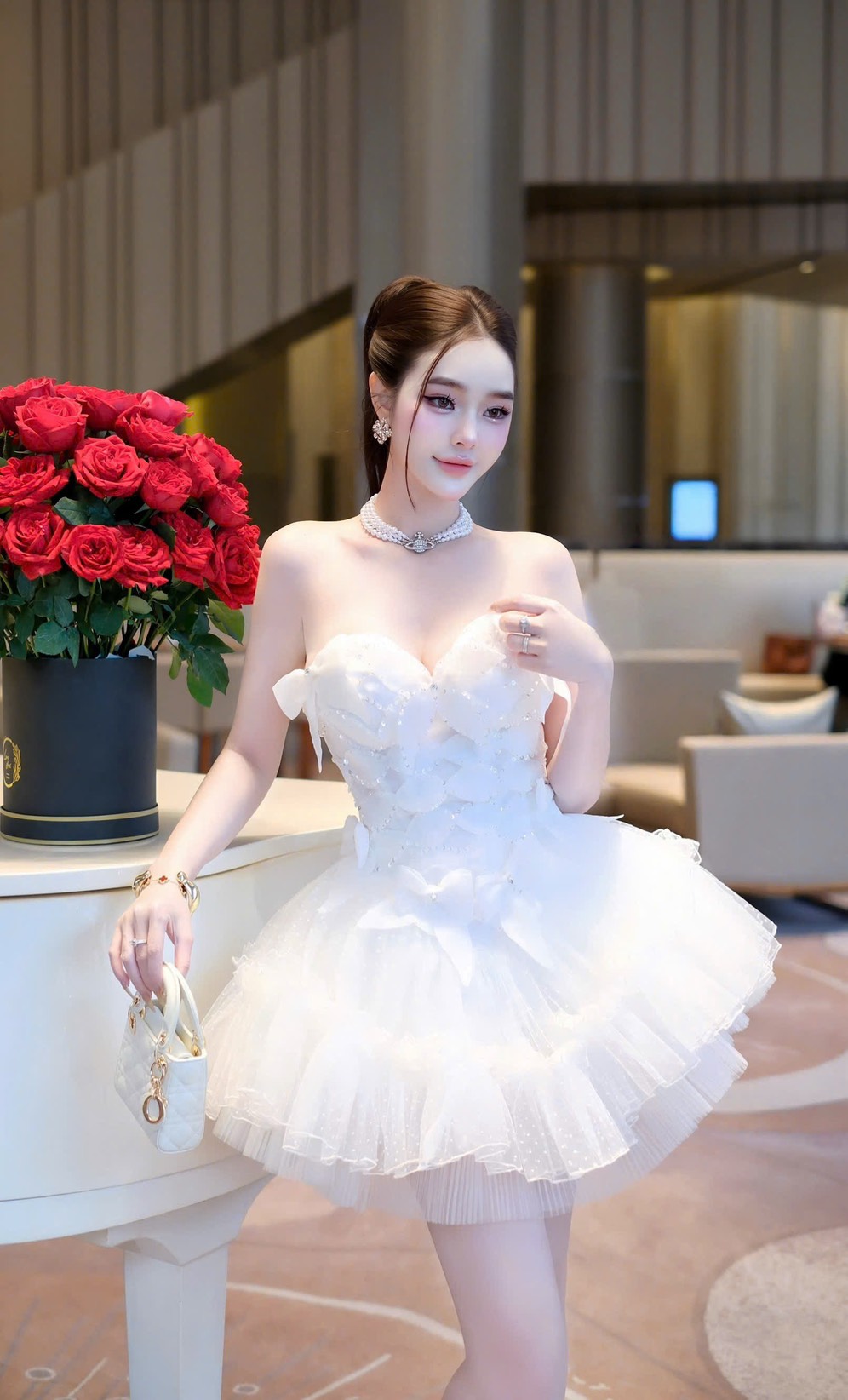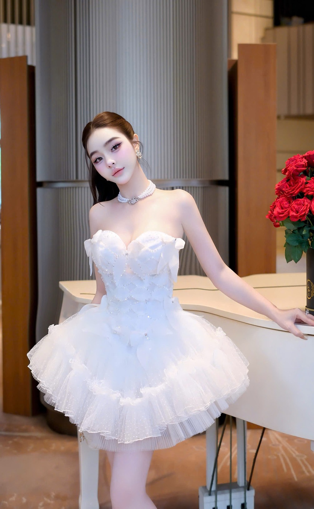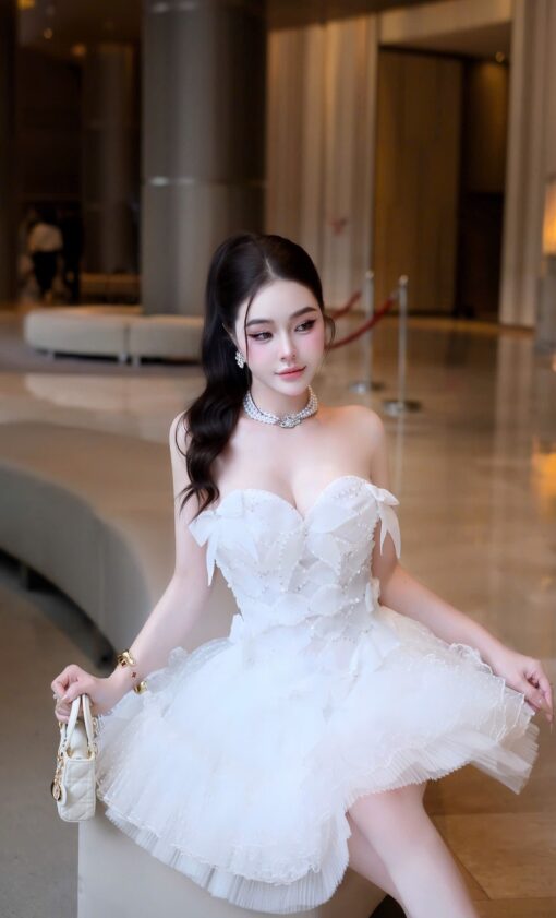 ชุดเดรส เกาะอก แต่งดอก+กลิตเตอร์ สีขาว 2020 Size S