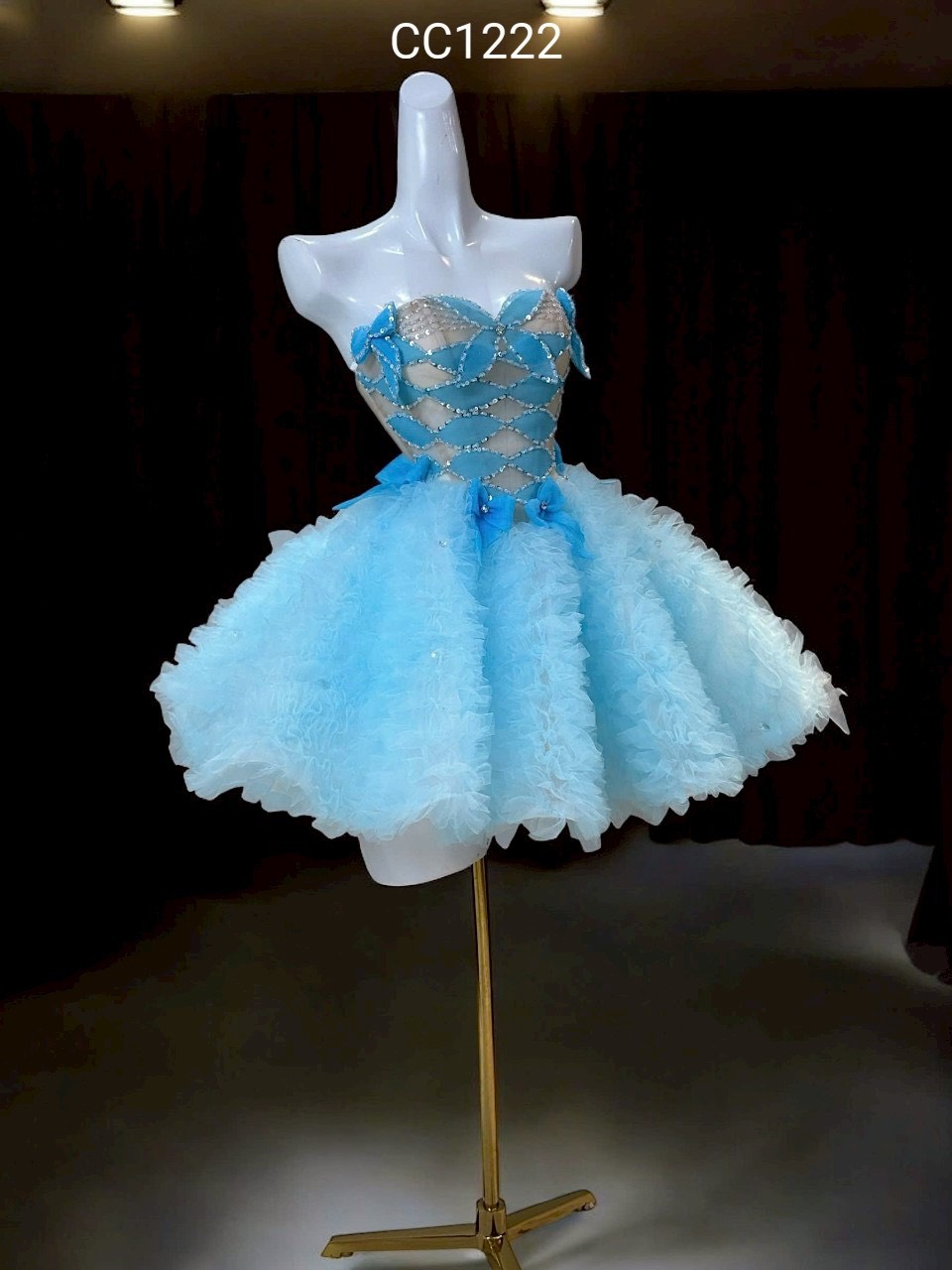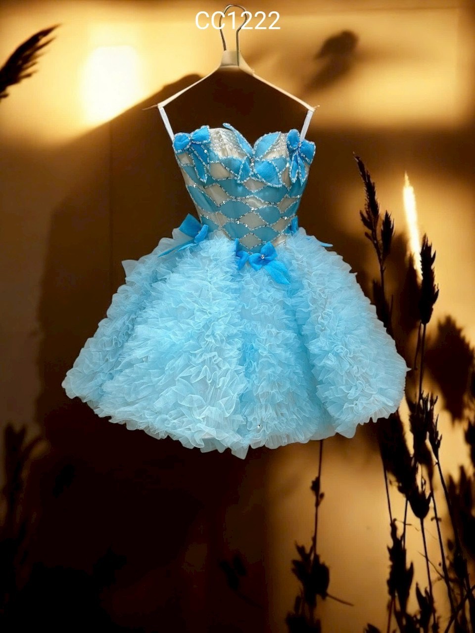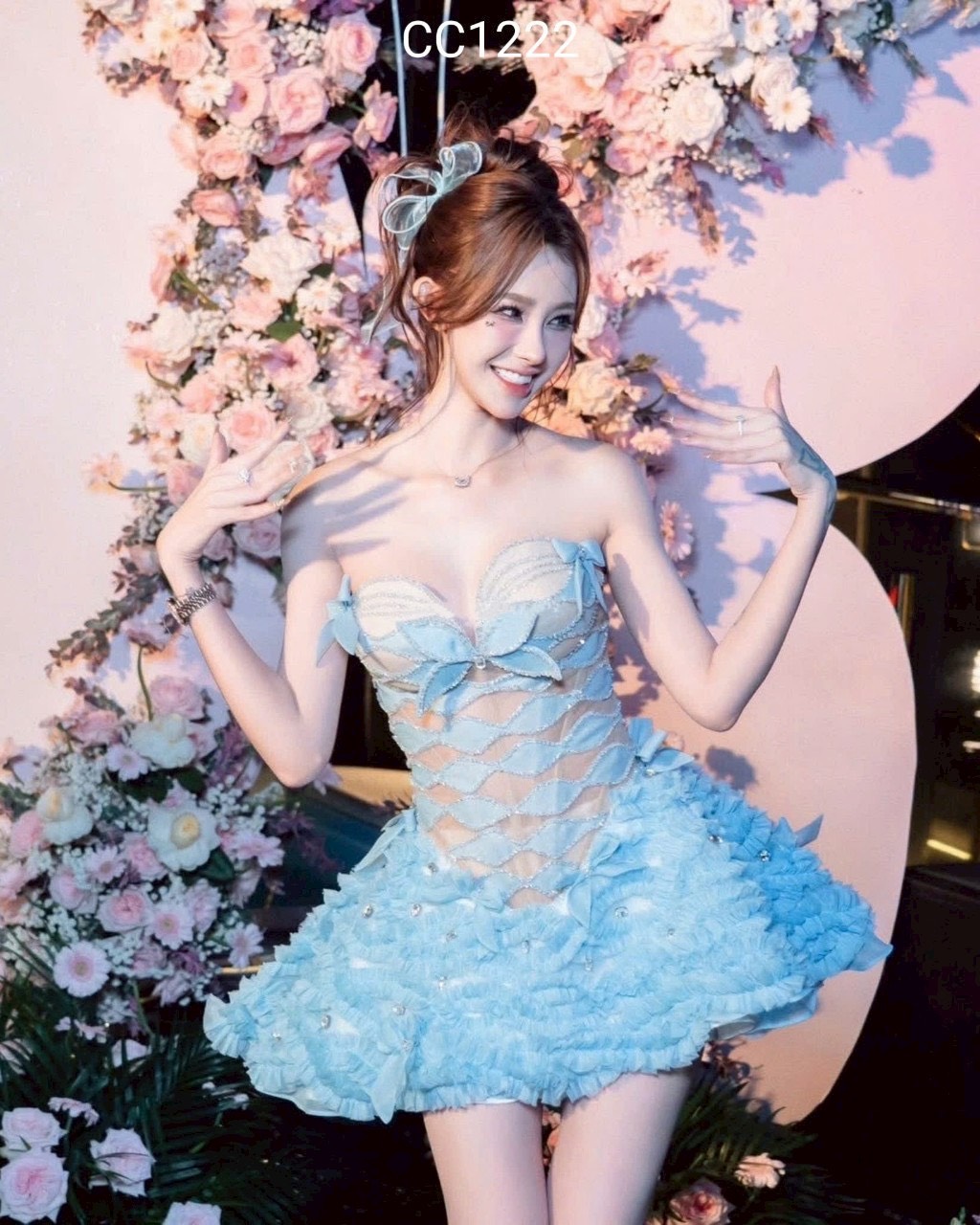 ชุดเดรส เกาะอก แต่งโบว์ สีฟ้า 2045 Size M