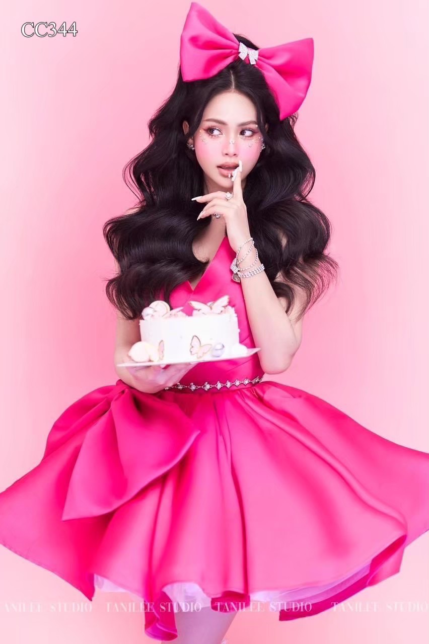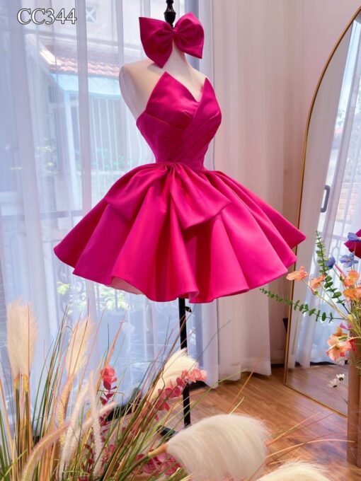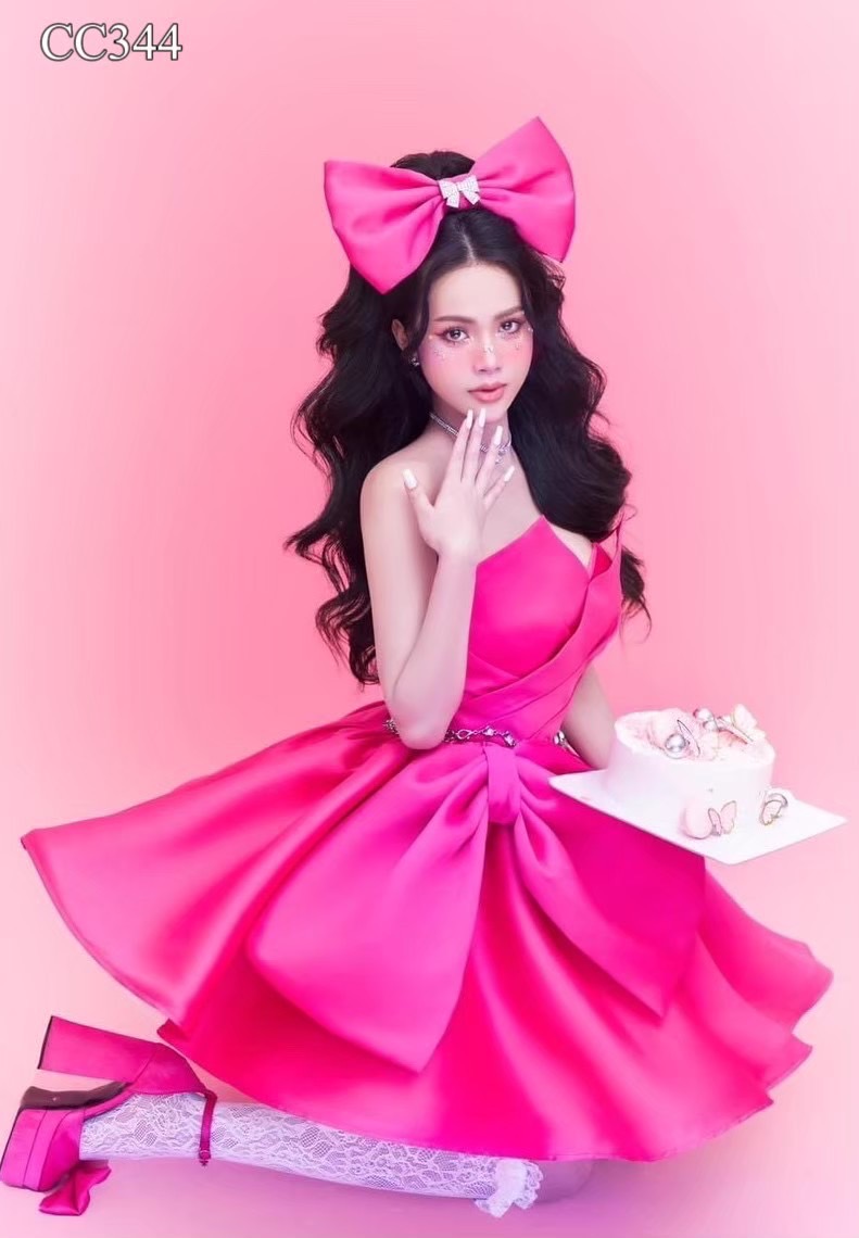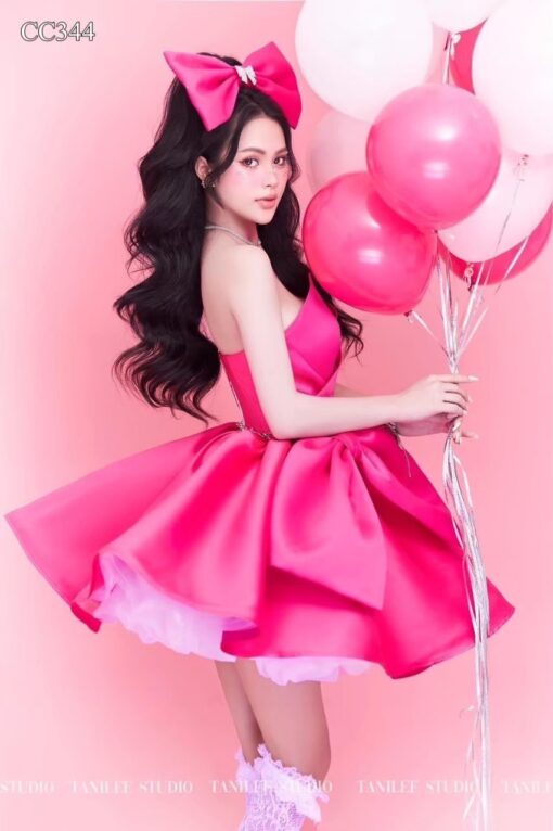 ชุดเดรส เกาะอก แต่งโบว์ สีบานเย็น 2111 Size S