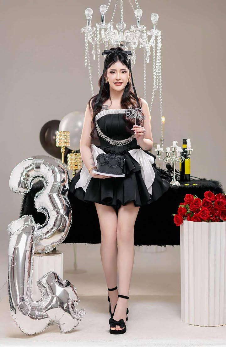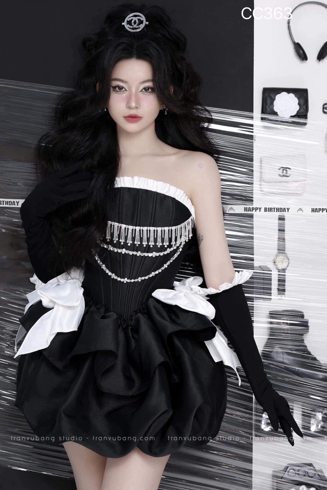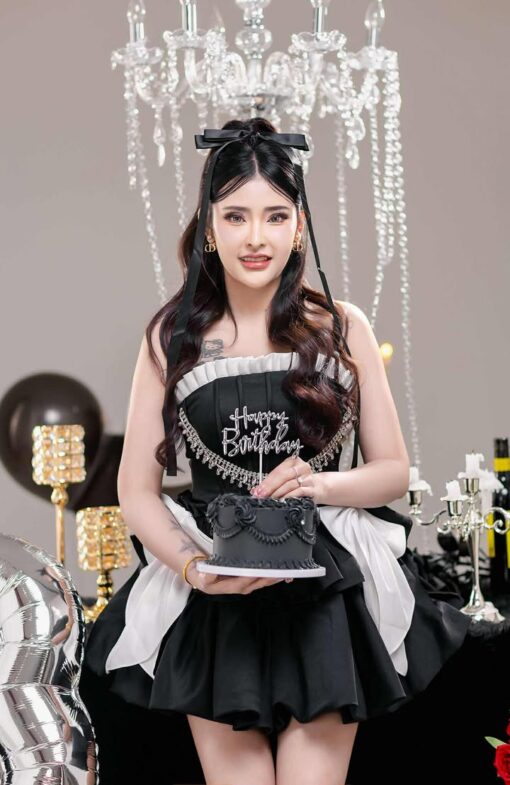 ชุดเดรส เกาะอก แต่งโบว์+เพชร สีดำ 2116 Size S
