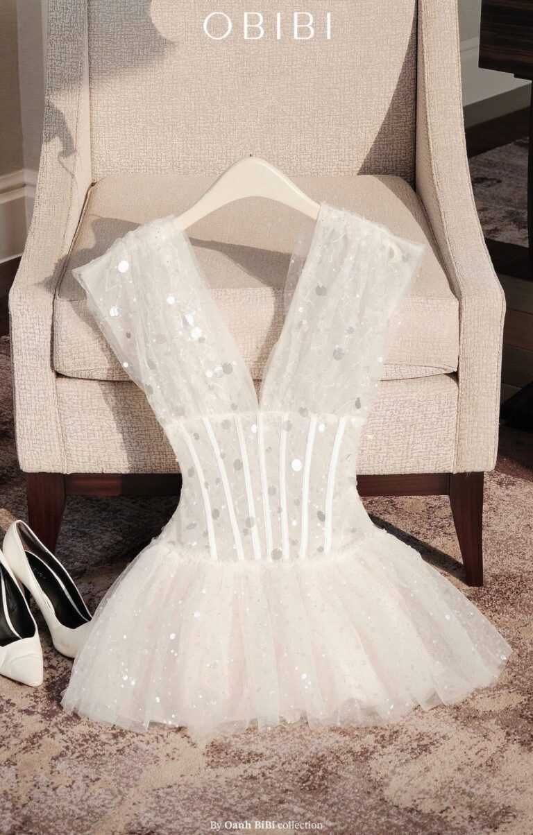 ชุดเดรส เกาะอก แต่งกลิตเตอร์ สีขาว 2025 Size M