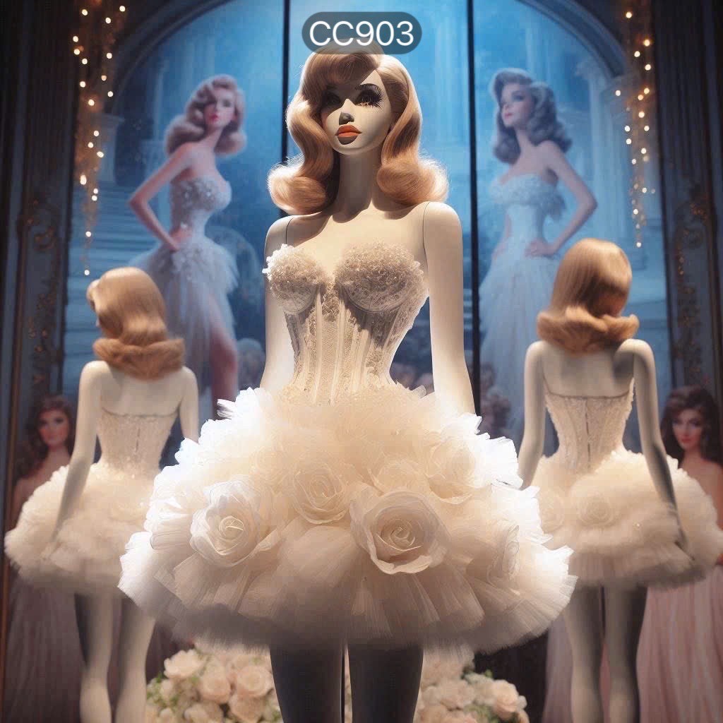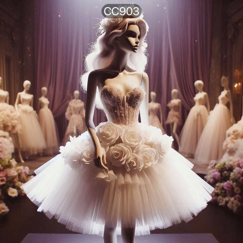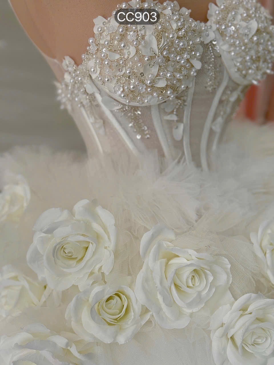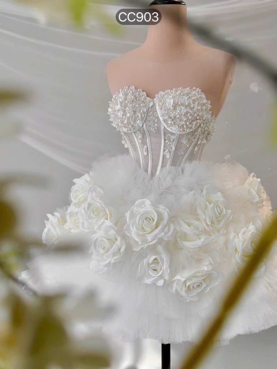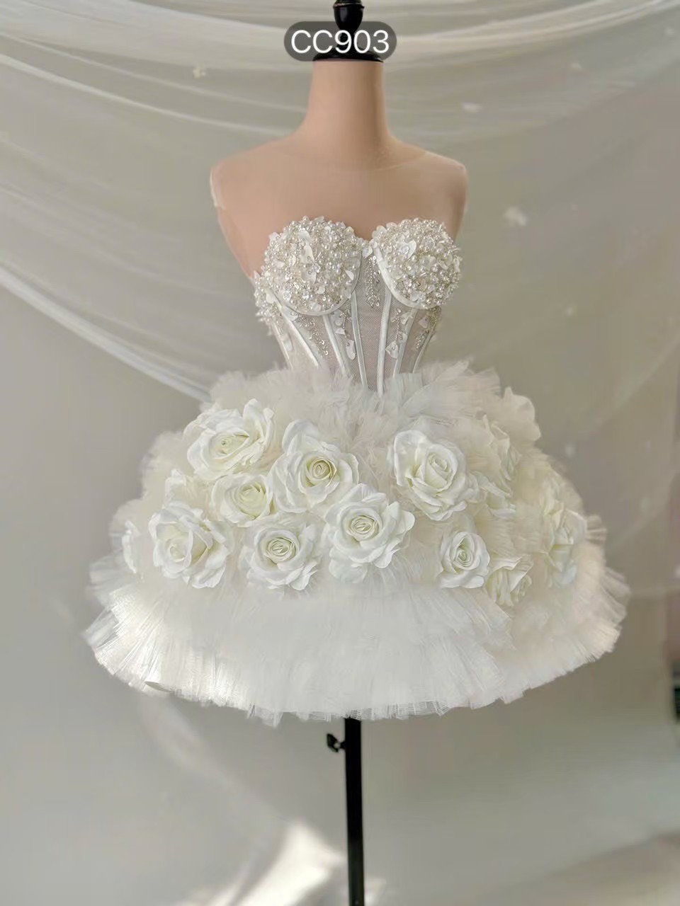 ชุดเดรส แต่งมุก+ดอก สีขาว 2062 Size M