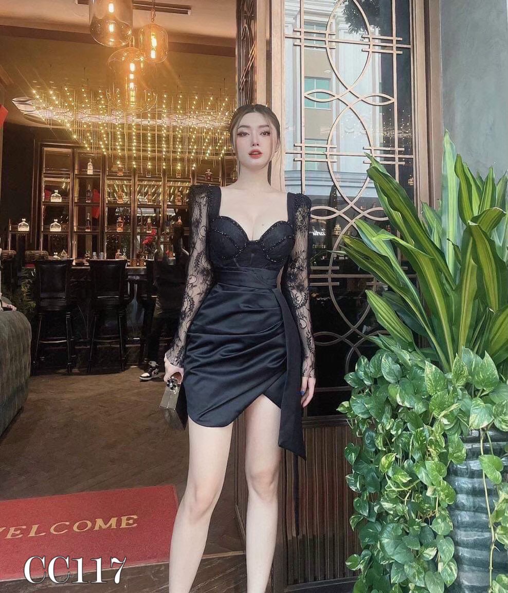 ชุดเดรส แต่งมุก+ลูกไม้ แขนยาว สีดำ 2080 Size XL