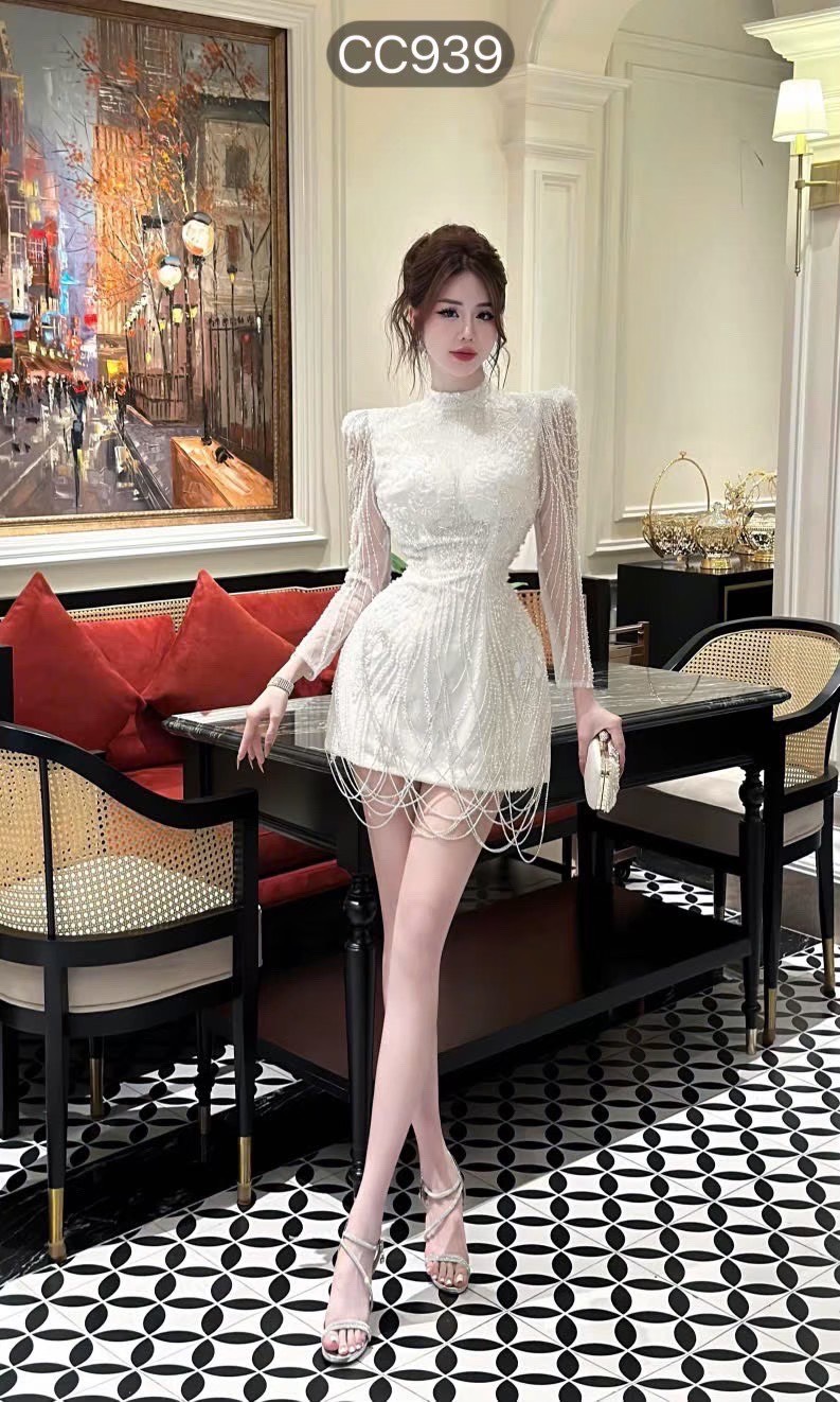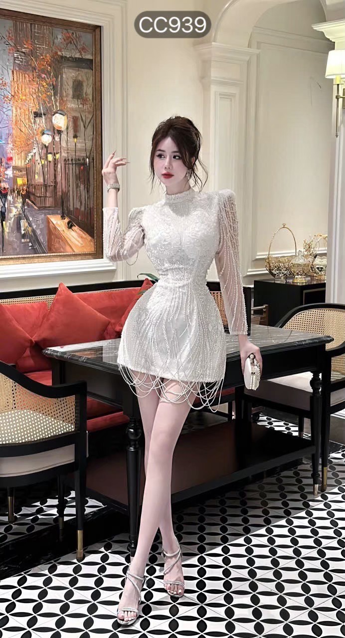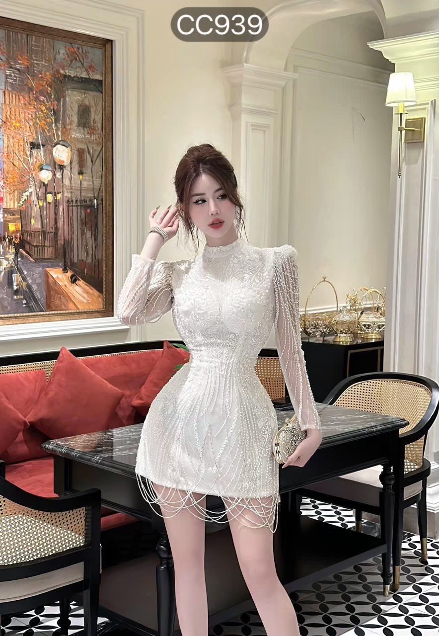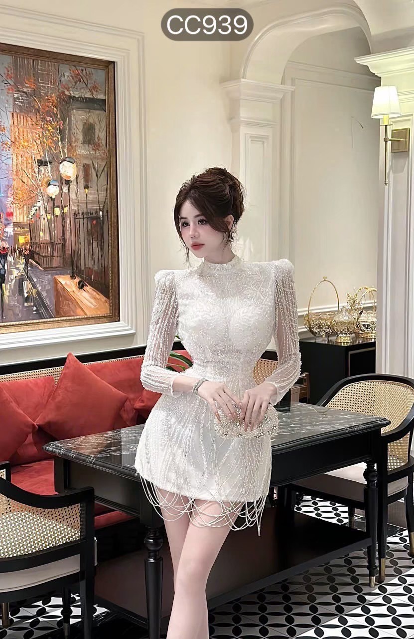 ชุดเดรส แต่งมุก แขนยาว สีขาว 2065 Size XL