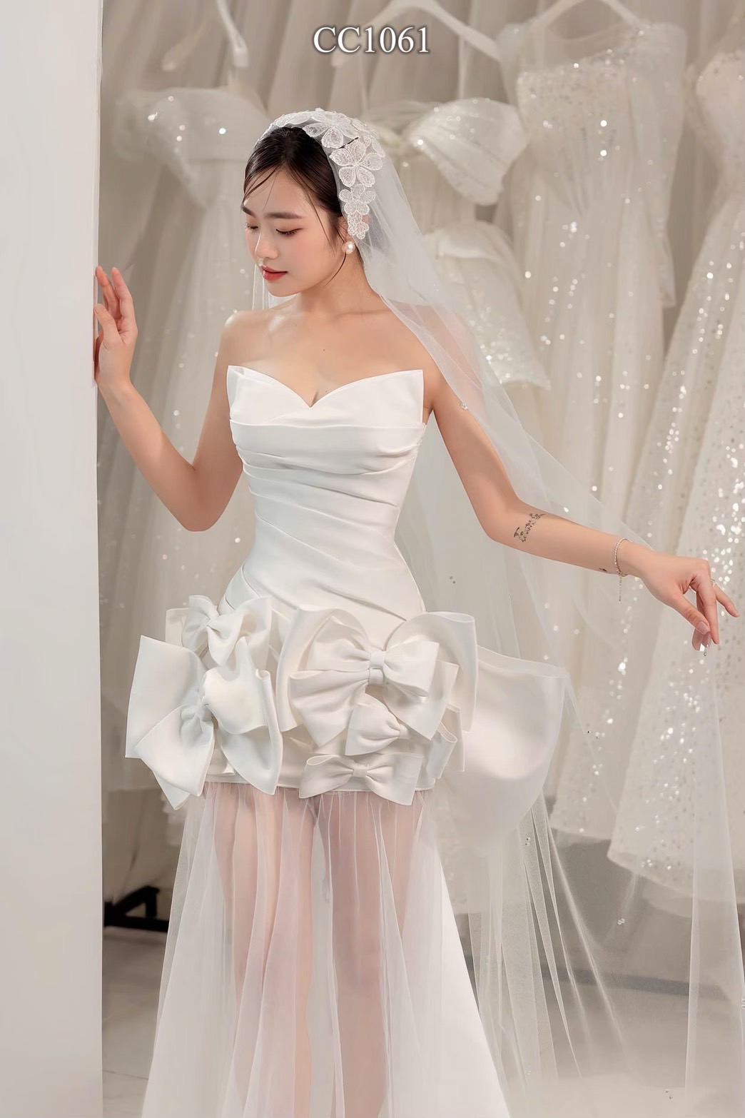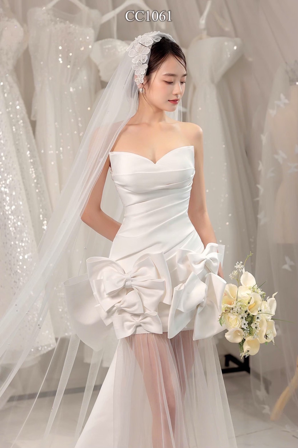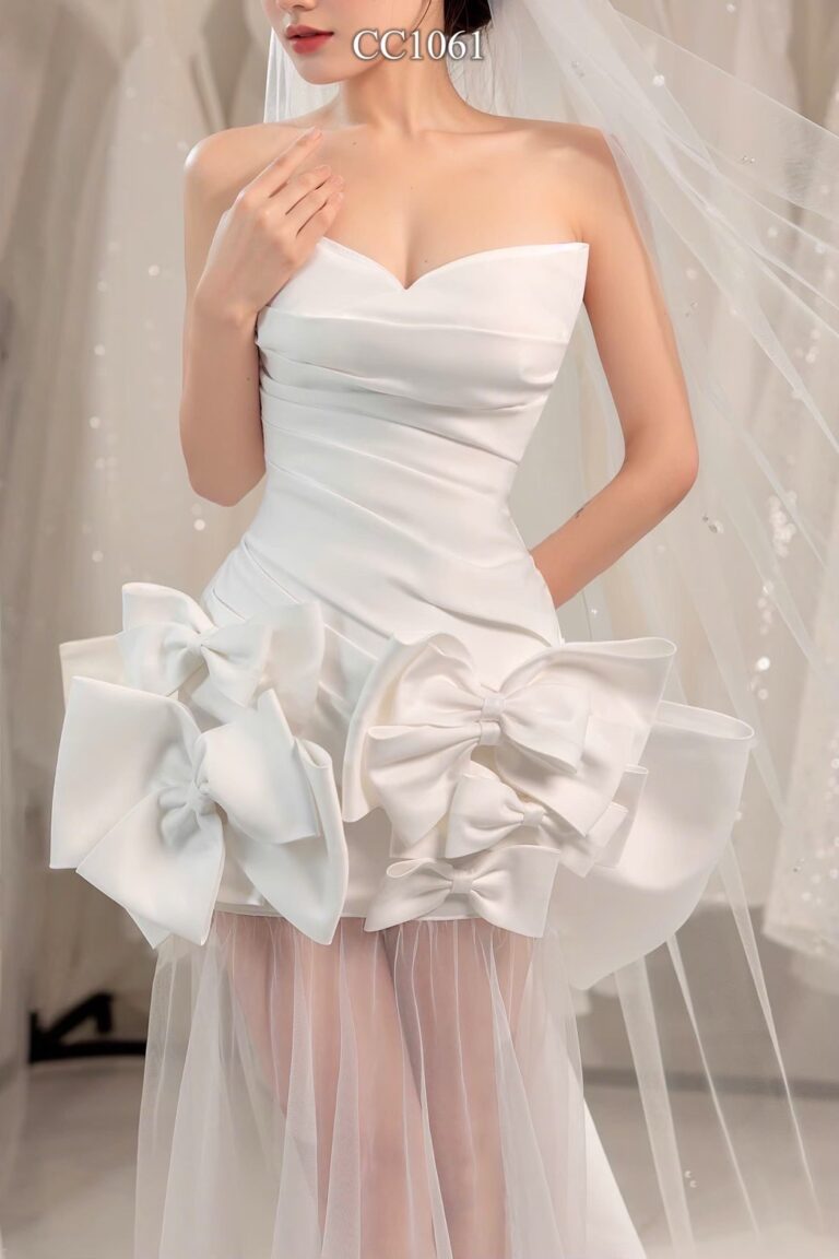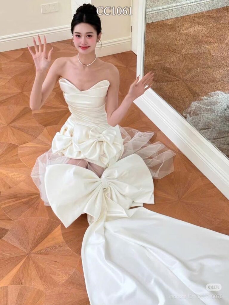 ชุดแต่งงาน ราตรียาว เกาะอก โบว์หลัง สีขาว 3016 Size S